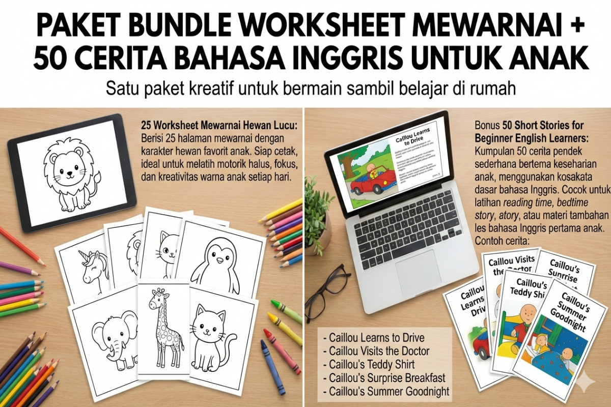 Anak mendapatkan dua manfaat sekaligus: terlatih motorik halus dan kreativitas melalui 25 worksheet mewarnai, serta meningkat kepercayaan diri dan kosakata bahasa Inggris melalui 50 short stories tingkat pemula. Bagi orang tua/guru, produk ini menjadi “paket siap pakai” yang menghemat waktu menyiapkan materi, sekaligus bisa dijadikan nilai tambah dalam layanan bimbingan belajar atau kelas privat.